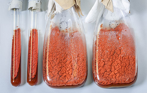 紅曲菌也稱為“紅曲霉菌”,屬于小型絲狀真菌。中國(guó)國(guó)家微生物資源平臺(tái)收藏的紅曲菌菌株共有20個(gè)種300多個(gè)菌。用于制備紅曲的菌種主要有紫色紅曲菌、安卡紅曲菌、巴克紅曲菌、紅色紅曲菌、變紅紅曲菌和煙色紅曲菌等6種。紅曲菌也是腐生真菌,嗜酸,尤喜乳酸,故常出現(xiàn)在乳酸自然發(fā)酵的基物中。